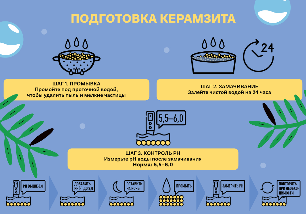 3. Слейте воду, измерьте её pH. Его допустимое значение — 5,5−6,0. Если оно выше — залейте керамзит на ночь чистой водой с добавлением pH-регуляторы кислотности Simplex® pH (-), до достижения pH воды, равного 3,0. Потом промойте субстрат проточной водой и снова сделайте замер. При необходимости повторяйте эту операцию несколько раз, пока pH воды не окажется в пределах 5,5−6,0. Всё, керамзит готов к использованию.