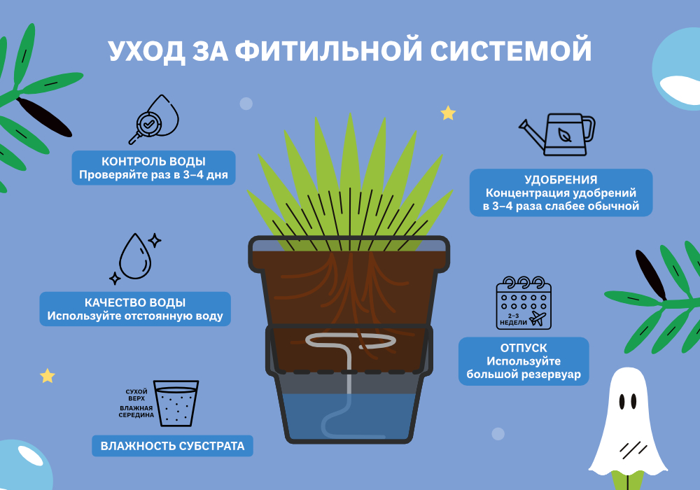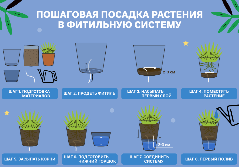 - дать растению влагу на первые дни, пока фитиль не начнет работать в полную силу.